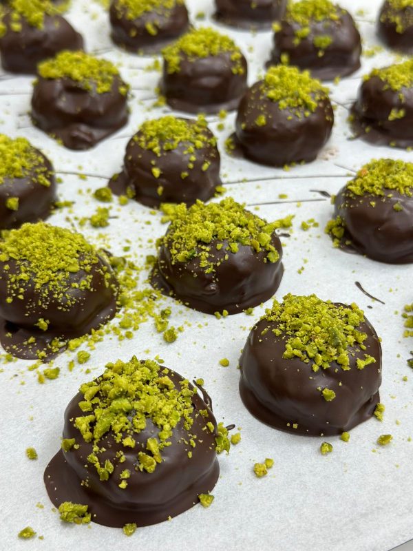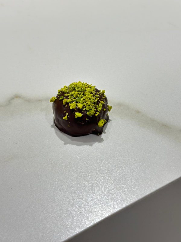 La peculiaridad de este polvorón es su textura: delicada y sorprendente al paladar, debido a la combinación del pistacho crujiente con la capa de chocolate.